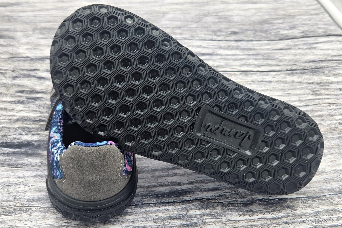Nízká vycházková obuv s měkkou podešví. Krásně se přizpůsobí dětským nožkám, sedí na nožku širší v prstech, normální nárt. Tenisky jdou dobře dotáhnout na úzký kotník.