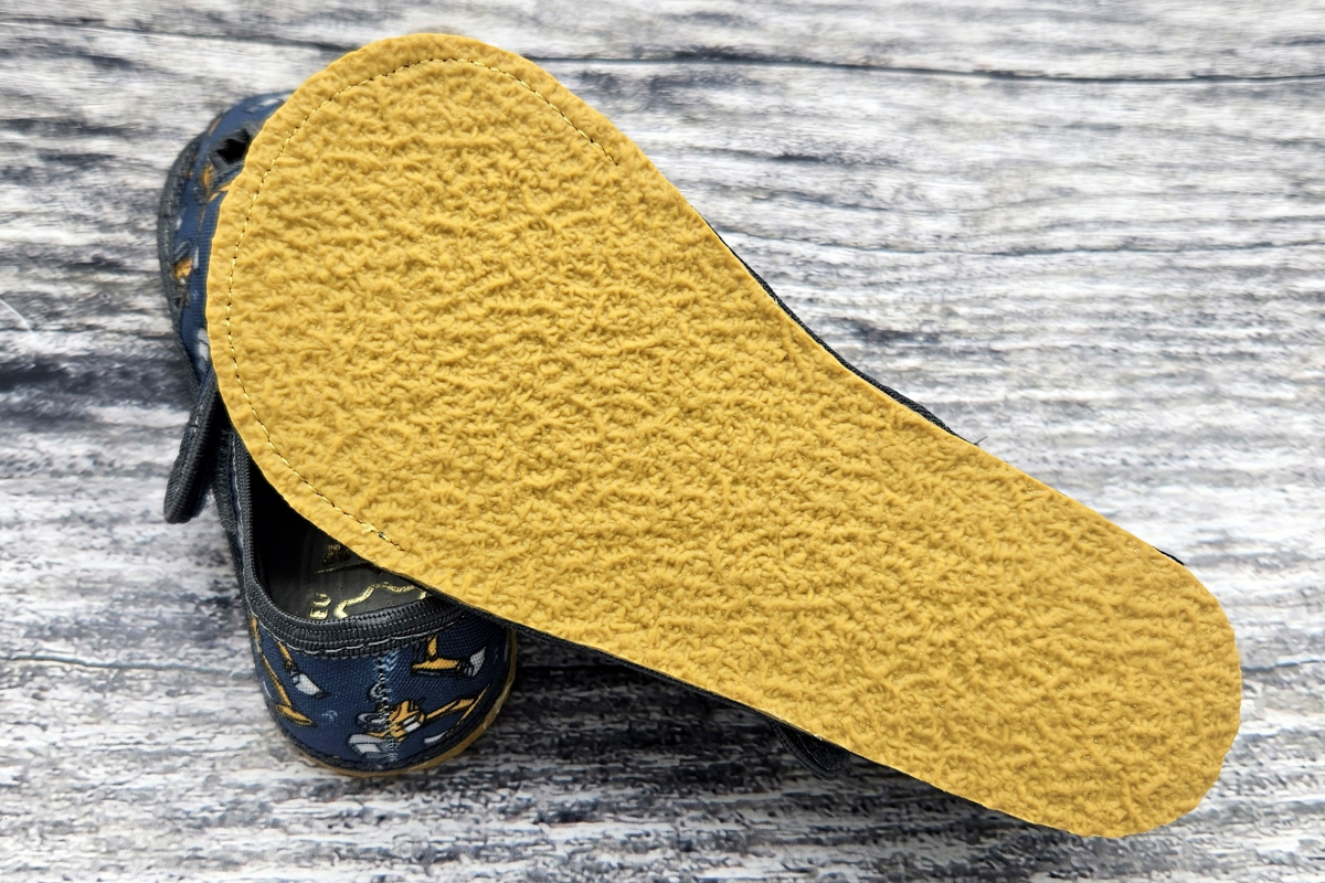 Barefootové přezůvky vyrobené z kvalitních materiálů v Polsku. Jsou krásně ohebné, podrážka má 3 mm a je vyrobena z termoplastického kaučuku. Díky této podrážce jsou přezůvky protiskluzové. Stélka je kožená a lze ji vyjmout. Pata je malinko zpevněná.