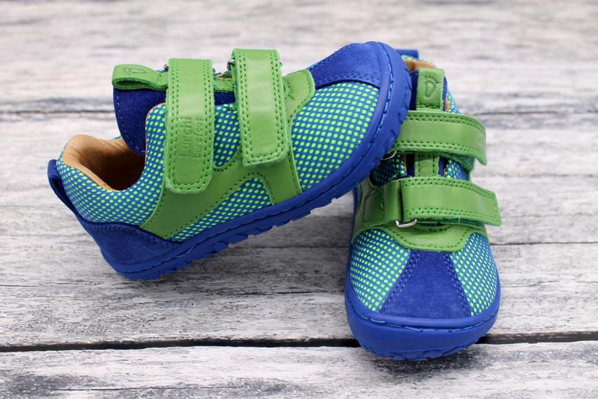 Kvalitní barefoot tenisky německé značky LURCHI. Vyrobené v kombinaci hladké kůže broušené kůže a textilu. Podšívka je také kožená. Jsou vhodné na užší nožku, normální nárt, špička je anatomicky tvarovaná, boty sednou i na dominantní paleček. Bez zpevněné paty (ale drží pěkně tvar), nulový drop, měkká podrážka s protiskluzovým vzorkem.