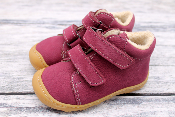Zimní kožené barefoot botky pro drobné nožky s normálním nártem. Vyteplené jemným umělým kožíškem.
